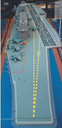 Для того чтобы превратить ТАВКР пр. 1143.4 в авианосец, способный обеспечивать базирование сверхзвуковых истребителей горизонтального взлета и посадки, значительным изменением подвергнут его верхнюю палубу. Полетная палуба будет продлена до самого носа корабля, где будет сооружен трамплин с углом схода 14 о (во многом такая форма палубы будет схожа с формой палубы российского ТАВКР проекта 1143.5 «Адмирал Флота Советского Союза Кузнецов»). Общая длина верхней (полетной) палубы составит около 280 м, а непосредственно взлетная полоса будет иметь длину около 200 м и ширину на сходе около 20 м. Для эксплуатации самолетов типа МиГ-29К этого вполне достаточно, поскольку при испытаниях в 1989-1992 гг. на «Кузнецове» («Тбилиси») опытные МиГ-29К успешно взлетали с трамплина с дистанций разбега 180 и 105 м.