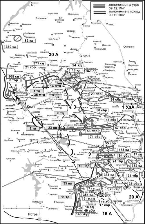 «Группа Ремизова овладела районом Клушино и развивала наступление на Веревское; 7 гв. сд овладела районом Никольское; 354 сд, отразив контратаку пехоты и танков противника из района Александровка, к 13.00 9.12 овладела районом Алабушево – Чашниково; 8 гв. сд с 17 сбр и 1 гв. тбр овладели районом Александровка – Андреевка и частью сил укрепляли позиции в районе Крюково Каменка; 18 сд с 49 сбр и 146 тбр внезапной атакой овладели районом Горетовка – Бакеево – свх. «Общественник». К исходу 9.12 дивизия овладела районом Дедово – Хованское; 9 гв. сд с 40, 36 сбр и 17 тбр, сломив сопротивление противника, овладели районом Снигири – Рождествено и развивали наступление на район Трухоловка – Жевнево» [799].