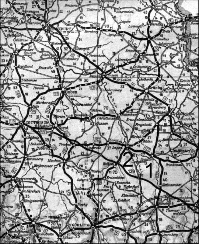 Карта Силезии с указанием мест: 1 — Шпроттау и 2 — Заган, которые находились на Имперской дороге между Коттбусом и Бреслау.