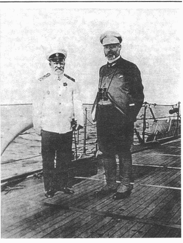 Адмирал Н.О. Эссен и депутат Государственной Думы А. И. Гучков на палубе крейсера «Рюрик». Июль 1911 г.