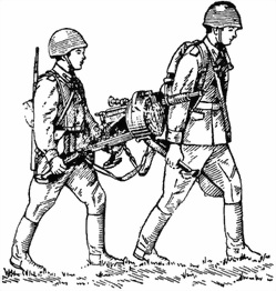 — помощник наводчика переводит станок в походное положение, для чего поднимает рукоятки зажимов вверх и складывает ноги, закрепляет ноги зажимами, прижимая их рукоятки к ногам; переносит на лямках станок и в руках одну-две коробки с выстрелами;