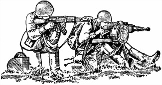— подносчик располагается обычно справа и сзади в 2–3 м от помощника наводчика в готовности подать помощнику наводчика коробку с выстрелами и принять от него ленту и пустую коробку, а также принимает положение, удобное для стрельбы из автомата.