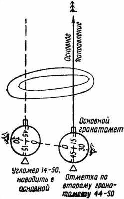 Для построения параллельного веера по основному гранатомету командир отделения командует: «Веер». Каждый помощник наводчика выставляет над вертикальной осью прицела веху (ночью — фонарь). Наводчик основного гранатомета отмечается по вехе другого гранатомета (рис. 48) и докладывает, например: «По второму — сорок четыре пятьдесят». После этого устанавливает первоначальный угломер. Командир отделения, приняв отметку основного гранатомета, изменяет ее на 30–00 и командует, например: «Второму, угломер четырнадцать пятьдесят, наводить в основной». Наводчик второго гранатомета устанавливает скомандованный угломер, наводит свой гранатомет в веху (фонарь) основного гранатомета, после чего отмечается по ранее указанной точке наводки и докладывает командиру отделения отметку по точке наводки. Вехи убираются по окончании наводки (отметки) по ним.