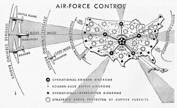 На схеме в центре территории США в подземелье располагается Командный пункт ВВС на манер английского. Жирными кружками обозначены пять основных аэродромов дальних стратегических бомбардировщиков, истребителей сопровождения и самолётов-заправщиков. Они обеспечивают нанесение ударов по целям в радиусе 6 тысяч миль (9600 км). В зоне боевого воздействия этой наступательной мощи ВВС находятся Южная Америка, Новая Зеландия, Индонезия, Малайзия, Филиппины, Япония, Китай, СССР и вся Европа. Каждый аэродром стратегической авиации обеспечивается несколькими вспомогательными аэродромами.