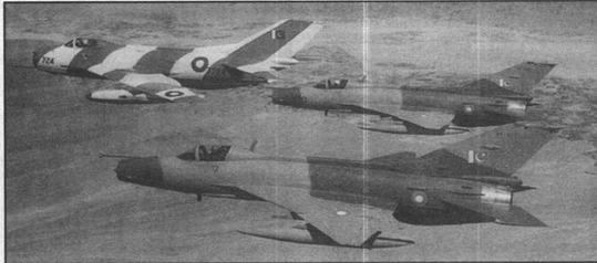 Первая партия поставленных из КНР Пакистану истребителей F-6 включала 72 самолета. Всего до 1981 г. было по ставлено 260 машин. Истребители F-7 принимали активнейшее участие в индо- пакистанской войне 1971 г. Вооружен- • ные этими самолетами 23-я, 25-я и 11-я эскадрильи решали в первую очередь задачи ПВО. Истребители F-6 выполнили 650 боевых вылетов на воздушный бой или патрулирование, сбив семь индийских самолетов (три Су-7, три "Хантера" и один МиГ-21), еще один Су-7 в воздушном бою с F-6 получил повреждения. Потери ВВС Пакистана составили, в числе прочих, четыре самолета F-6. Еще 184 боевых вылетов пилоты F-6 в ходе войны 1971 г. выполнили на штурмовку наземных целей.- Своего пика количество боеспособных истребителей F-6 в ВВС Пакистана достигло в 1981 г., когда самолеты этого типа состояли на вооружении девяти эскадрилий.