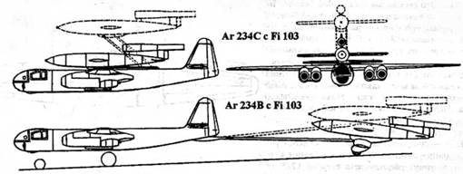 Еще одним вариантом буксировщика был Ar 234С с ракетой "Хеншель" Hs 294. С ракетой на буксире Ar 234С достигал скорости 750 км/ч у земли при дальности 400 км и 816 км/ч на высоте 8000 м при дальности полета 760 км. Еще лучше была разработана схема запуска Fi 103 со спины Ar 234С. Для этого использовалась специальная качалка, на которой Fi 103 поднималась в момент запуска, после наведения на цель.
