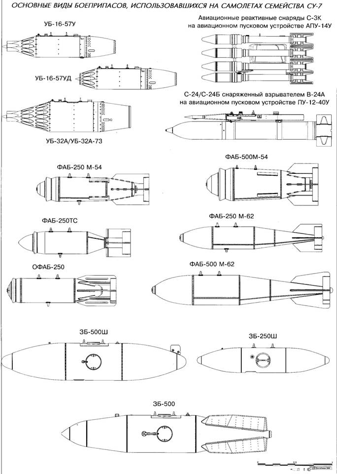 В противоположность этому, многочисленное семейство 57-мм ракет типа С-5, запускаемых из блоков типа УБ- 16 и УБ-32, вместе с мощными 240-мм НАР С-24 и С-24Б широко применялись с самолетов типа Су-7Б с самого начала и до конца эксплуатации и вместе с авиабомбами и пушками НР-30 составляло основу вооружения "семерки".