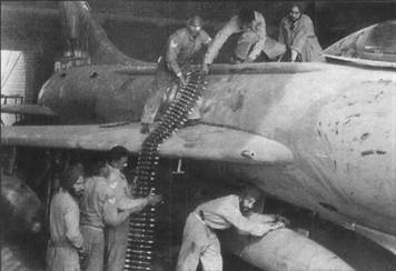 Зарядка пушек НР-30 на Су-7БМК ВВС Индии. В нарушение установленной процедуры зарядки с применением специального транспортера-загрузчика тяжелую ленту подают вручную
