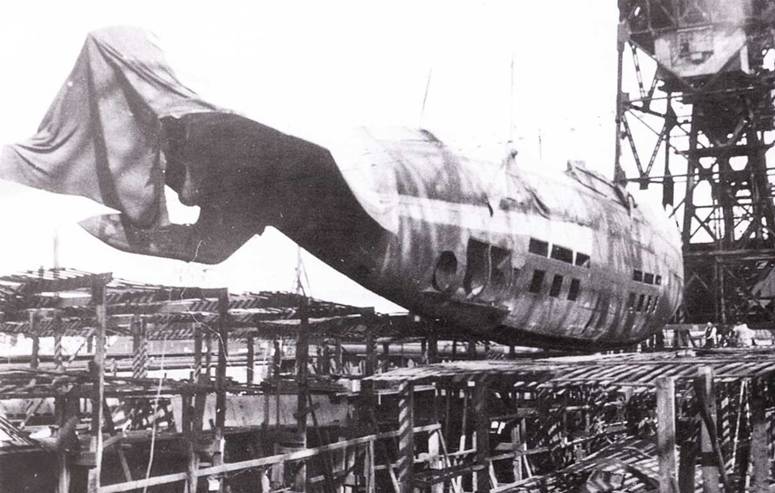 Корпус подлодки Вальтера U 794 переносится 150-тонным плавучим краном со своей строительной площадки в эллинге № 8 фирмы «Германия-Верфт», август 1943 г. Справа внизу под реечным покрытием подлодка U 795 и слева – подлодка U 249.