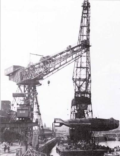 Подъём со стапели U 794 двумя плавучими кранами, 7 октябри 1943 г. У лодки ещё отсутствует плексигласовое покрытие мостики.