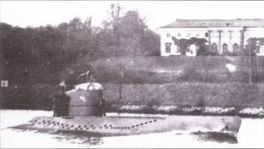 Транспортировка корпуса U 794 с помощью плавучего крапа в машинный цех «Германия-Верфт».