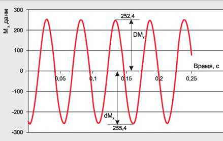 Результаты проведенных тарировок позволили замерить изменение изгибающих моментов и перерезывающих сил в контрольных сечениях при одновременном нагружении лопасти осевым усилием и переменным изгибающим моментом как в плоскости вращения лопасти, так и в плоскости тяги. На рис. 3 приведена циклограмма изменения изгибающего момента при переменном нагружении в плоскости вращения. Можно увидеть, что амплитуда переменного изгибающего момента от цикла к циклу изменяется незначительно.