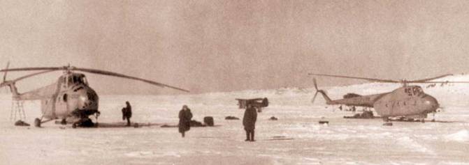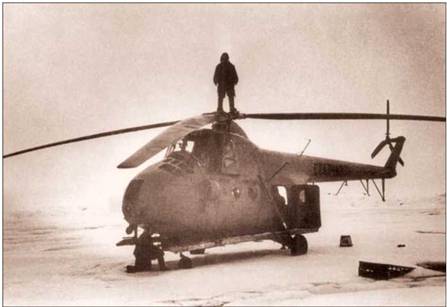 …Мы начинаем грандиозный воздушный поход к Северному полюсу. Низкие облака вынуждают нас лететь над самой землей. Я вижу, как вертолет Афонина под действием сильного порывистого встречного ветра кренится, летит, как по кочкам. Работая рычагами управления, пытаюсь выдерживать на этой «ухабистой дороге» дистанцию между нашими вертолетами и высоту полета. Второго пилота в моем экипаже нет: все еще непросто уговорить летчиков пересесть с освоенных и ставших родными самолетов на непонятную и опасную бескрылую технику – вертолет. Рядом со мной на месте второго пилота – штурман Саша Громчевский. Он уже записал время взлета, посматривает на колеблющиеся стрелки приборов, показывающие скорость и высоту, на компас, сличает пролетаемую местность с картой. Бортмеханик Константин Лещенко внимательно наблюдает за приборами контроля работы двигателя. Внизу, в передней части грузовой кабины, работает бортрадист Говорухин – он согласился пролететь с нами только часть маршрута.