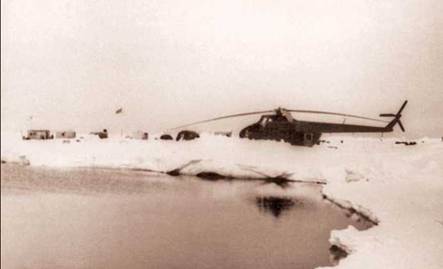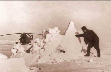 Массы льдов, а вместе с ними и льдину, на которой находилась наша станция, морскими течениями и ветрами все более уносило на юг. Тогда и решили мы с Константином Лещенко и штурманом Сашей Громчевским при выполнении очередного задания вдали от дрейфующей станции слетать до Северного полюса. Когда еще такой случай представится! Погода в центральной части Ледовитого океана в июне 1956 года не очень радовала: ограниченная видимость и туманы. Но несмотря на это мы полетели: заправили бензина в два с лишним раза больше, чем обычно, и взяли курс на Северный полюс. Когда приборы показали, что мы достигли цели, посадили вертолет на льдину. Я взобрался на втулку винта и попросил бортмеханика сделать фотографию. Видимость была очень плохой, и снимок получился нечеткий. Но «исторический» момент был запечатлен, и это главное! Наш вертолет стоял на Северном полюсе, и все меридианы северного полушария Земли сходились к нему!