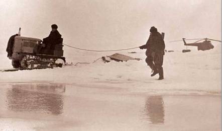 .К моменту нашего прилета на станции скопилось много грузов, которые нужно было срочно вывезти на ледовый аэродром для отправки их самолетами Ли-2 на СП-4 и на остров Диксон. С отправкой грузов медлить было невозможно: ухудшение погоды могло привести к подвижке льдов, а значит и к разрушению нынешнего ледового аэродрома. И мы, чтобы не упустить время, буквально впряглись в работу по перевозке грузов. Сами садились на станционный трактор, подвозили на нем грузы к вертолету, загружались, а затем летели на ледовый аэродром, где грузы уже «исчезали» в недрах самолетов Ли-2.