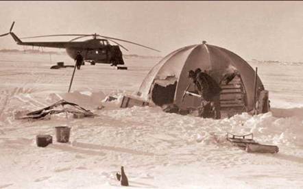 …О нашем житье-бытье на станции хочется рассказать отдельно, тем более что курьезных случаев было предостаточно. Жили мы в маленьких двухместных куполообразных палатках, вмещавших из мебели только две раскладушки. Хотя палатки и были изготовлены из двойной ткани, внутри было так же холодно, как снаружи: никакого обогрева не предусматривалось. Так что если на улице минус 42, в палатке в лучшем случае минус 40. Трудно передать словами, что чувствовал человек, снимающий с себя все теплое перед тем как влезть во влажный, промерзший спальный мешок. Чтобы уснуть, нужно было час-два прогревать мешок теплом собственного тела.