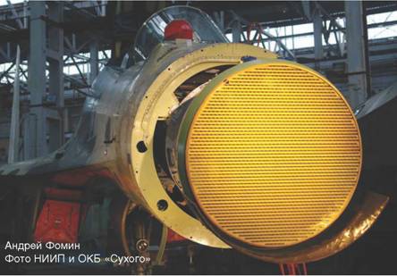 На фото вверху: РЛСУ «Ирбис-Э», новейшая разработка НИИП им. В.В. Тихомирова для истребителя Су-35, на борту летающей лаборатории Су-30МК2 №503, на которой она проходит летные испытания с начала 2007 г.