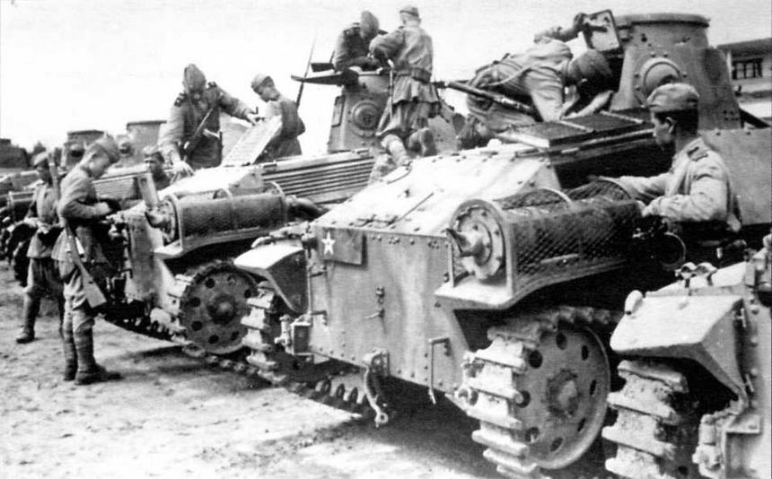 Советские офицеры и солдаты осматривают японские танки Ха-го» осле капитуляции Квантунской армии. Маньчжурия, август 1945 года (вверху и слева)