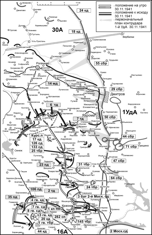 Можно отметить и чисто психологический момент: наверняка командование сильно ослабленной 30-й А чувствовало себя спокойнее за водяным «валом». В этом случае, даже кавалерийские дивизии армии державшие оборону севернее Дмитрова на рубеже канала и имевшие в своих рядах не более 450 бойцов[364] имели шанс удержать довольно протяженный фронт.