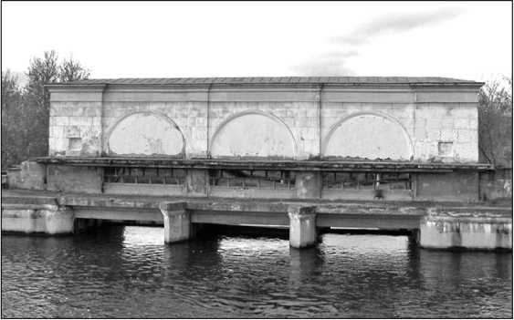 Место, где р. Сестра протекает под каналом. На противоположной стороне зимой 1941 г. были установлены конструкции, перекрывшие водный поток.
