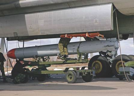 Внизу: загрузка крылатой ракеты воздушного базирования на самолет Ту-95МС