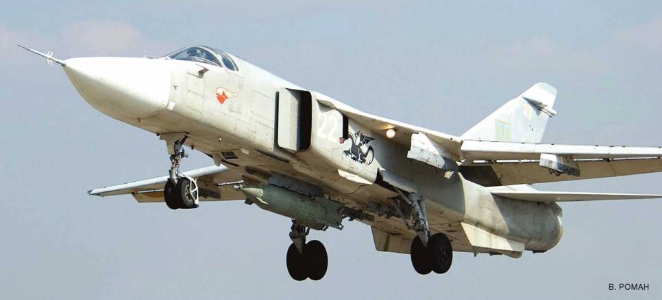 Основа ударной авиации современных Воздушных Сил Украины – фронтовой бомбардировщик Су-24М (на подвеске самолета – корректируемая бомба КАБ-1500Л). Такие машины состоят на вооружении бомбардировочно-разведывательной авиабригады в Староконстантинове