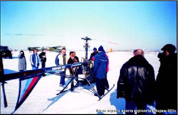 25 января 2003 года вертолет доставили на аэродром, собрали, опробовали работу двигателя на земле. После опробования вытащили вертолет в поле, подальше от строений и препятствий. Я осмотрел вертолет, занял пилотское место, запустил двигатель. Все системы работали нормально. Проверил систему управления – все в норме. Ввел коррекцию, взял ручку «шаг-газ» вверх. Вертолет плавно оторвался от земли и устойчиво завис на высоте 0,5 м. Особых проблем, я не ощутил, управление вертолетом легкое и плавное. Через 20 минут попробовал произвести перемещения вперед, назад, влево, вправо. Вертолет перемещался без особых проблем, разворачивался на месте влево и вправо на 360 градусов за 15 сек. Вибрации на вертолете отсутствовали. «Мираж-001» устойчиво висит на высоте до 2 м, летит по прямой на высоте до 3 .м. Может подлететь на стоянку и плавно совершить посадку. Ткк волей случая мне довелось стать летчиком-испытателем.