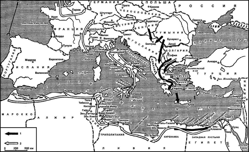 Рис. 12. Средиземноморский театр военных действий в 1941–1945 гг. 1 – наступление немцев на Балканы (1941 г.) и на Египет (1942 г.); 2 – наступление союзников в Северной Африке (1942–1943 гг.), в Италии (1943–1945 гг.) и во Франции (1944–1945 гг.)
