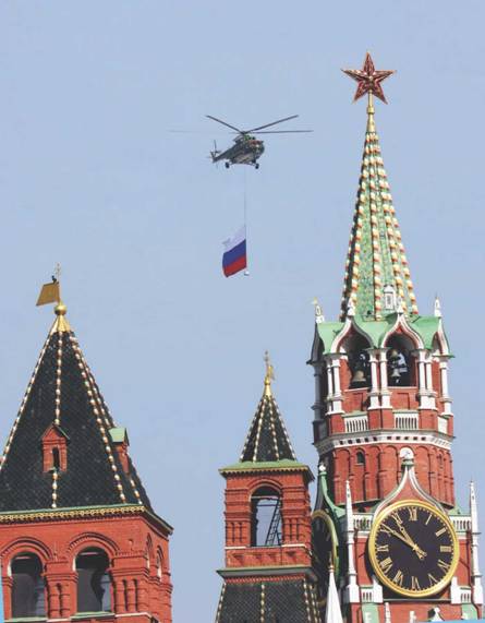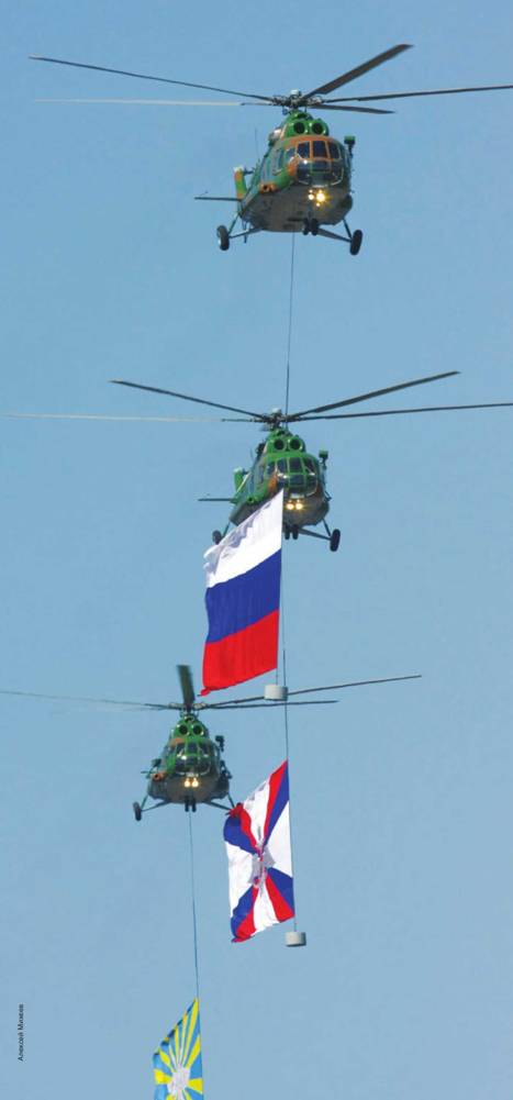 Наконец настало утро 9 мая 2008 г. Брусчатку Красной площади еще только покидали последние образцы самоходной боевой техники (а в этот раз в парадных колоннах прошли армейские джипы «Тигр», бронетранспортеры БТР-80, боевые машины пехоты и десанта БМП-3 и БМД-4, САУ «Спрут» и «Мста-С», танки Т-90, РСЗО «Смерч», комплексы ПВО «Тунгуска», «Тор-М2», «Бук-М1-2» и С-300ПМУ «Фаворит», а также самоходные ракетные комплексы – оперативно-тактический «Искандер» и стратегический «Тополь» – всего 111 единиц боевой техники), как примерно в 10.50 небе показалось звено из трех вертолетов Ми-8 из состава подмосковной авиационной дивизии особого назначения с авиабазы в Малино. На высоте около 200 м и скорости чуть более 100 км/ч они пронесли над Красной площадью флаги России, Вооруженных Сил и ВВС. Пилотировали машины экипажи АДОН – полковник Владимир Грязнов, подполковники Сергей Кулаев, Валерий Коляденков, Олег Зуев и Николай Бабихин.