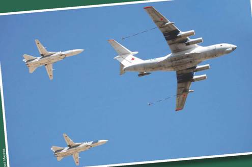 Парадную колонну самолетов ВВС возглавил тяжелый военно-транспортный самолет Ан-124-100 «Руслан» Солнечногорского Краснознаменного Ордена Кутузова 3-й степени военно-транспортного авиационного полка, дислоцируемого в пос. Сеща Брянской обл. (командир экипажа – военный летчик 1-го класса подполковник Евгений Костяненко). Эскортировала его пара истребителей Су-27 липецкого авиацентра. Следом прошел стратегический бомбардировщик-ракетоносец Ту-160 («Василий Решетников») из гвардейского тяжелобомбардировочного авиаполка с авиабазы Энгельс под Саратовом в сопровождении двух истребителей-перехватчиков МиГ-31 из Саваслейки (Нижегородская обл.). Самолет Ил-78 отдельного гвардейского Орловского авиаполка самолетов-заправщиков с аэродрома Дягилево (Рязанская обл.) имитировал дозаправку в воздухе стратегического ракетоносца Ту-95МС из Энгельса, сопровождаемого парой истребителей МиГ-29 из Липецка. Другой Ил-78 прошел в строю дозаправки с двумя фронтовыми бомбардировщиками из липецкого авиацентра – Су-24М и новейшим Су-34 с бортовым №02, который пилотировал сам начальник Центра боевой подготовки и переучивания летного состава ВВС России летчик-снайпер Заслуженный военный летчик России генерал-майор Александр Харчевский.