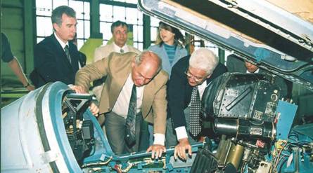 Главком ВВС Бразилии и его заместитель генералы Луис Карлос да Сильва Буено (справа) и Жозе Карлос Перейра (слева) осматривают кабину модернизированного Су-27СКМ во время их визита на КнААПО в августе 2003 г.