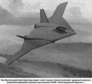 С октября 1997 г. работы по исследованию облика многофункциональной ударной авиационной системы, способной решать оперативные и стратегические задачи, были начаты и в Великобритании. Там реализуется долгосрочная программа создания перспективной ударной системы большой дальности FOAS (Future Offensive Air System – перспективная наступательная авиационная система), обладающей высокой тактической гибкостью и способной поражать широкий круг целей вне зависимости от времени суток и погодных условий, сохраняя при этом высокую боевую живучесть. Исследования по программе FOAS были начаты при участии фирмы ВАе, государственного научно-исследовательского агентства DERA (Defence Evaluation Research Agency), а также ряда частных авиастроительных фирм и научных центров. Рассматривался широкий диапазон различных решений – пилотируемые самолеты (как новые, так и модификации уже существующих), беспилотные боевые ЛА многократного использования, а также крылатые ракеты большой дальности, запускаемые с самолетов-носителей, переоборудованных из пассажирских и военно-транспортных самолетов. При этом допускалась и комбинация вариантов. Рассмотрение различных концепций FOAS предполагается завершить в 2001 г., а ее поступление на вооружение возможно приблизительно через 20 лет. В настоящее время правительство Великобритании рассматривает возможность интернационализации этой программы – в частности, привлечения к участию в ней Франции и других западноевропейских государств.