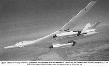 В ближайшее время Ту-95МС и Ту-160 будут переоснащены малозаметными КР нового поколения, способными нести как ядерные, так и неядерные боевые части. По сообщениям печати, новые ракеты должны обладать дальностью, превышающей 5000 км, иметь ЭПР, «соизмеримую с сотыми долями метра» и КВО порядка 5-6 м (образно говоря, ракета должна иметь возможность влететь в футбольные ворота). Летные испытания такой ракеты начались в 2000 г Модернизация стратегических самолетов должна затронуть и их бортовое радиоэлектронное оборудование. Будет продолжаться последовательное расширение функциональных возможностей БРЭО для обеспечения группового взаимодействия носителей, а также взаимодействия с обеспечивающими системами и средствами. Вероятно, в течение первого десятилетия XXI века ДА России будет пополняться за счет серийного производства Ту-160, имеющих значительный модернизационный потенциал (как показал опыт, даже в нынешних, чрезвычайно тяжелых экономических условиях, промышленность способна передавать ВВС один-два самолета в год).