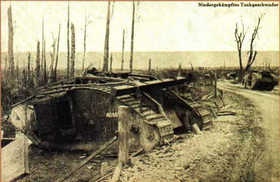 Подразделение британских танков, разгромленное в ходе германского контрнаступления у Камбрэ в ноябре 1917 года. Подлинные немецкие фотооткрытки периода Первой мировой войны.