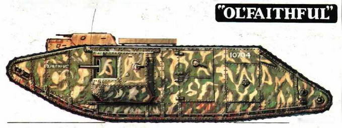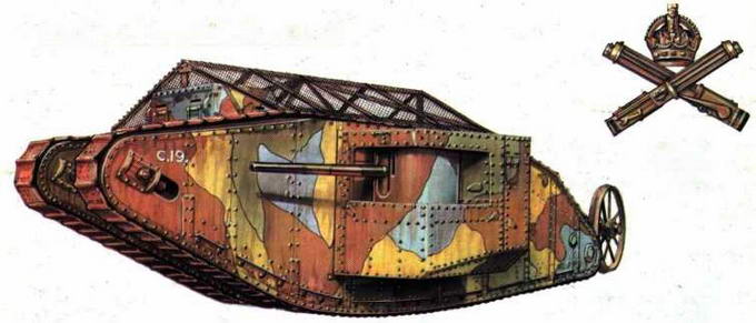 Тяжелый танк Mk IV "самка". 6-й (F) батальон Танкового корпуса. Сражение у Камбрэ, ноябрь 1917 года. Эмблема Танкового корпуса.