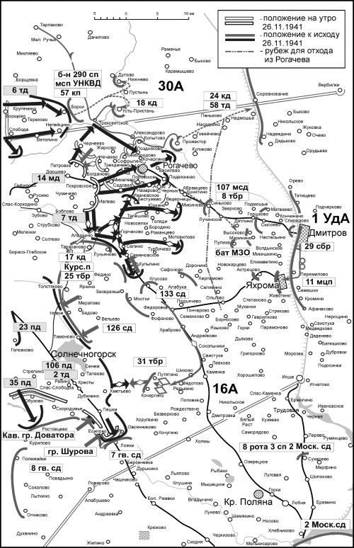 Пытаясь задержать противника на промежуточных рубежах, 30-я А старалась изыскать и силы для занятия рубежа канала Москва – Волга. Согласно записи в журнале боевых действий Западного фронта в Дмитров был отведен 923-й сп, а в Яхрому направлен 11-й мцп[112]. Кроме того, в своих мемуарах Г. И. Хетагуров[113] утверждает, что часть левофланговой группы он направил для занятия тылового рубежа на линии Паньково, Синьково, Ольгово. Но в действительности состав войск под Рогачево не изменился. Об этом можно говорить с полной уверенностью, поскольку новый командир группы начал свою деятельность с разработки подробного плана обороны села, в котором перечислены те же соединения, что вели бои 25 ноября[114].