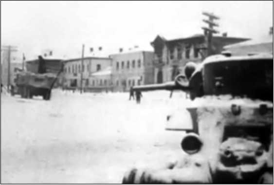 Центр Рогачева после освобождения. На переднем плане танк БТ оставленный при отступлении. Кадр из фильма «Разгром немцев под Москвой».