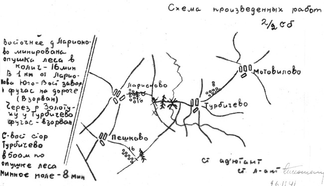 «26.11.41 г. роты работы в районе д. Мотовилово закончили и к 14.00 сосредоточились для обеда. В 14.4526.11.41 г. батальон выступил из дер. Мотовилово в пункт расквартирования с. Астрецово, имея задачей в пути произвести работу по заграждению и минированию. При выходе из д. Мотовилово, через 15–20 мин. в деревню вошло 10 немецких танков, деревню зажгли и обстреляли взвод 2роты, минировавший участок. Батальон был втянут в опушку леса по дороге, где сразу стал возводить завалы и минировать…» [126].