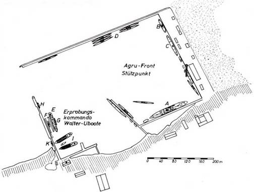 Схема дешифровки аэрофотоснимка гавани в Хела – базы испытательной команды подлодок Вальтера. Снимок был сделан 8 марта 1944 г.