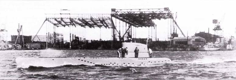 U 793 (Wa 201) во время испытательного рейса в апреле 1944 г. после постройки на верфи Блом и Фосс. К этому времени там уже строилась в левом эллинге (No. VI) подлодки U 2501 XXI серии.