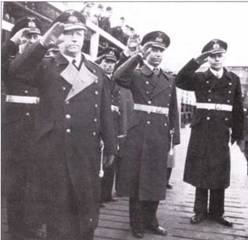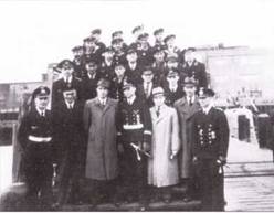 Во время сдачи кригсмарине U 792 присутствовали контр-адмирал Тедсен (слева) с офицерами-подводниками в парадной форме. Справа, вероятно, командир флотилии капитан Моле.