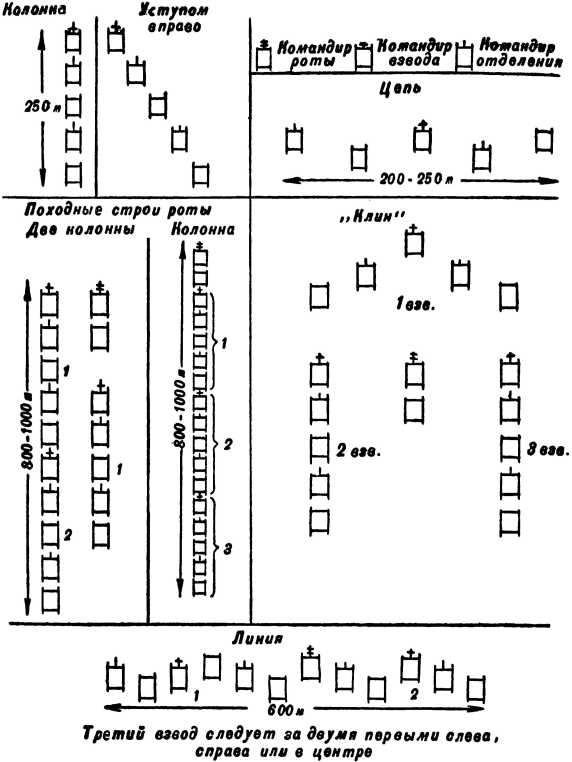 Рис. 1. Походные строи, предбоевые и боевые порядки танкового взвода и роты.