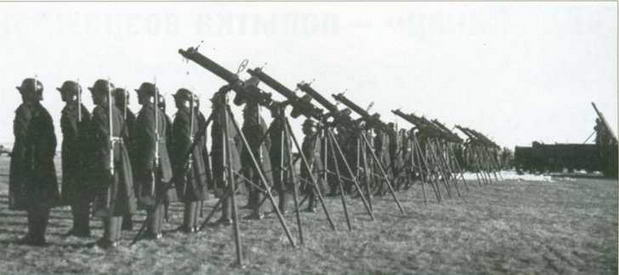 Батарея ПВО охраны Таллина на маневрах. На переднем плане 7,71-мм пулеметы "Виккерс" с кольцевыми зенитными прицелами на зенитных треногах. Справа видно 76-мм моторное орудие на шасси 3-тонного грузовика "Уайт". Окрестности Таллина, 2 марта 1935 г.