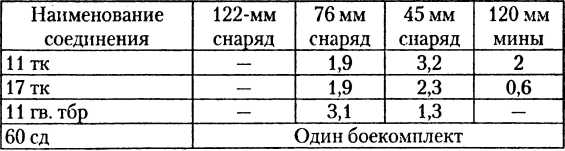 — по боеприпасам — 16 тк, 11 тк и 11 гв. тбр по одному бк, 194 сд — 0,1 бк; 60 сд — 0,5 бк, 115 сбр — 0,1 бк;