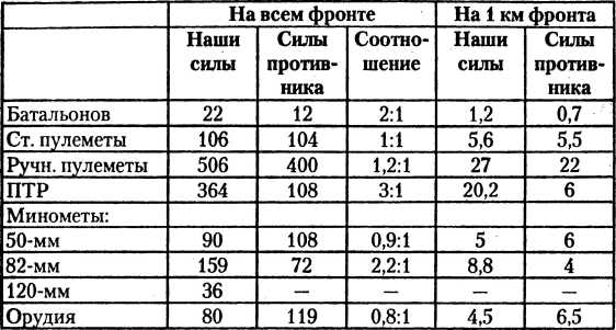 Артиллерия противника: противотанковая — 167 орудий; полковая — 46 орудий; дивизионная —120 орудий; тяжелая — 35 орудий; минометов — 306.