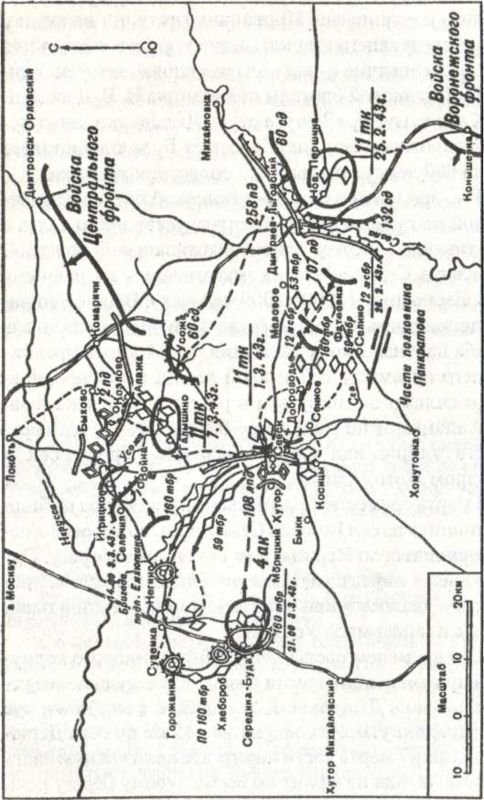 3. Войскам 2 ТА к утру 21.2.1943 г. занять исходное положение на рубеже Михайловка, Ротманово, Стар. Город, Сухой Ровец для наступления в общем направлении Дмитриев-Льговский, Севск, Трубчевск.