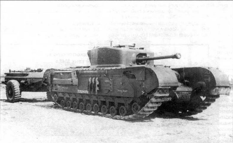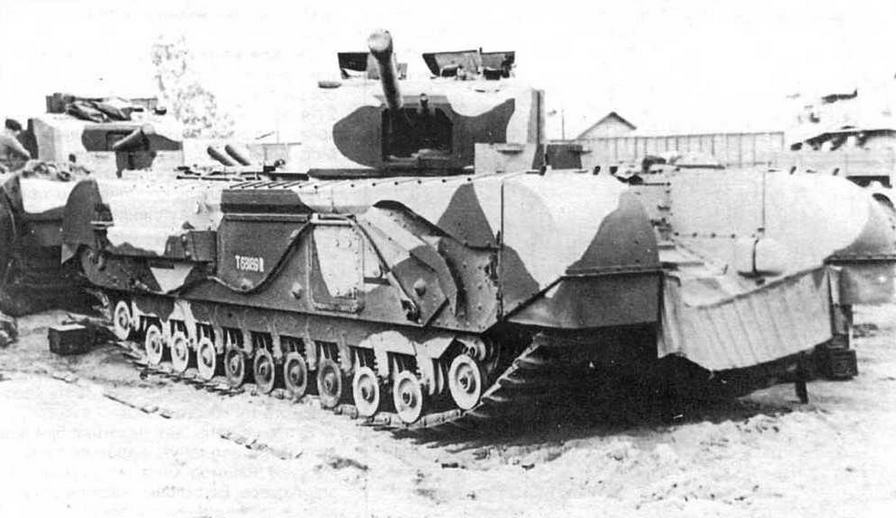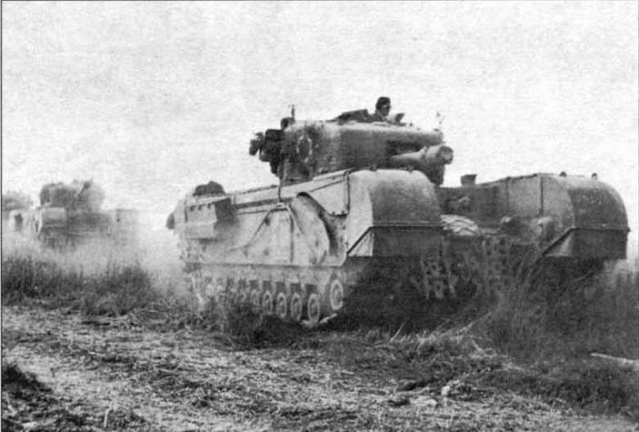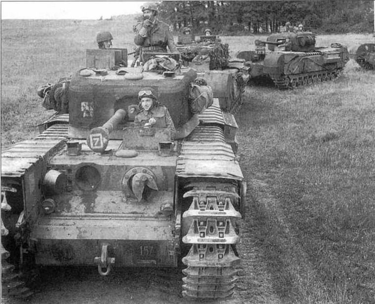В обеих бригадах имелись «Черчилли» различных модификаций: как вооруженные 6-фунтовыми пушками, так и 75-мм. Следует отметить, что в танковых войсках английской армии других пехотных танков в то время уже не было. Исключение составляли лишь немногочисленные «валентайны», использовавшиеся в качестве машин передовых артиллерийских наблюдателей и командирских танков в противотанковых частях, вооруженных самоходками «Арчер».