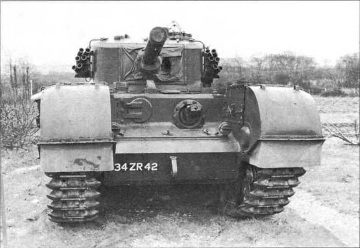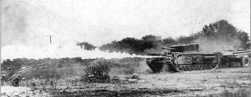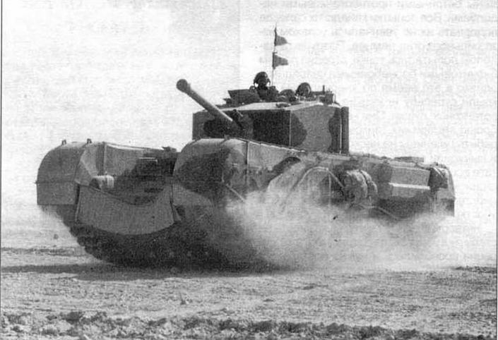 Именно разнообразные инженерноштурмовые «Черчилли» 79-й танковой дивизии и высадились одними из первых на французское побережье в день «Д» — 6 июня 1944 года. В их задачу входило преодоление многочисленных фортификационных сооружений противника в прибрежной полосе, с чем они, в общем- то, неплохо справились. Впрочем, им не раз приходилось пускать в ход и свое штатное пушечное вооружение. Здесь нелишним будет отметить, что эти обвешанные тралами, фашинами и направляющими для пуска удлиненных зарядов разминирования «страшилища», действовавшие на суше как обычные танки, внесли в этом своем качестве гораздо больший вклад в успешный ход боевых действий, чем при использовании своего специального инженерного оборудования.