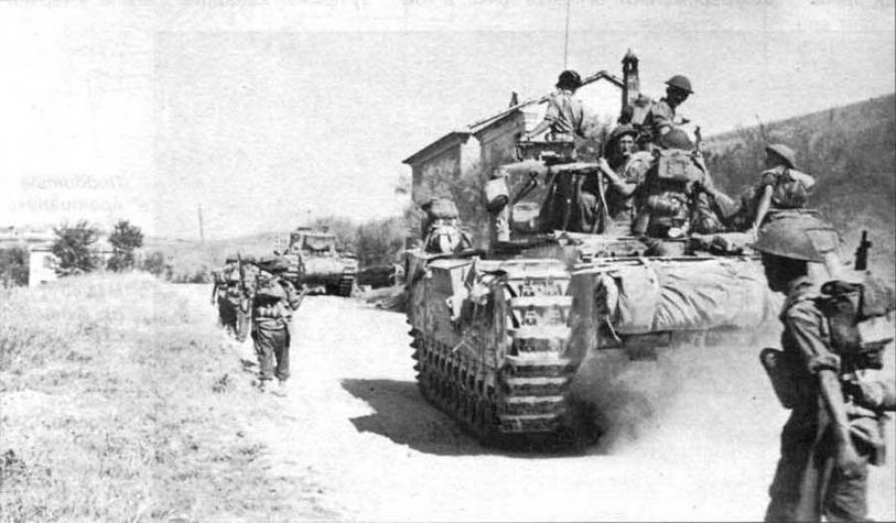 «Черчилли» с пехотой на броне движутся к «Линии Готов». Италия, август 1944 года