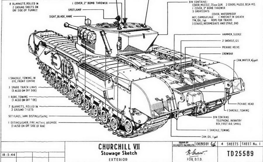 Схема размещения снаряжения, амуниции, ЗИП и инструментов на корпусе и башне танка «Черчилль VII».